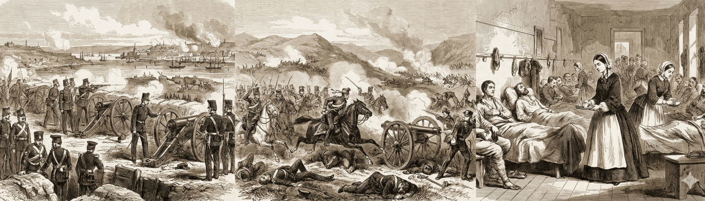 „Најважније операције у овом рату вођене су на пoлуострву Крим, на којем су се Енглези, Французи и Турци искрцали септембра 1854. године, пошто су претходно разбили руске трупе код Алме. Зато је читав рат и назван „Кримски“. Руси су се онда концентрисали на одбрану свог најјачег војно-поморског утврђења на Црном мору, града и луке Севастопољ.„