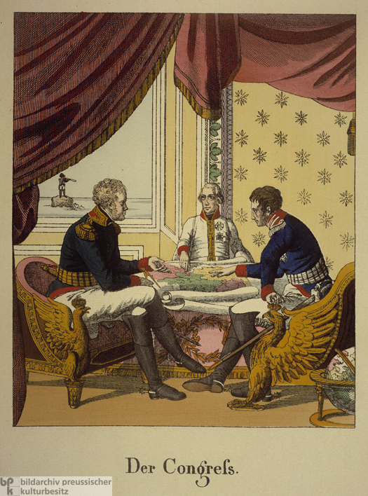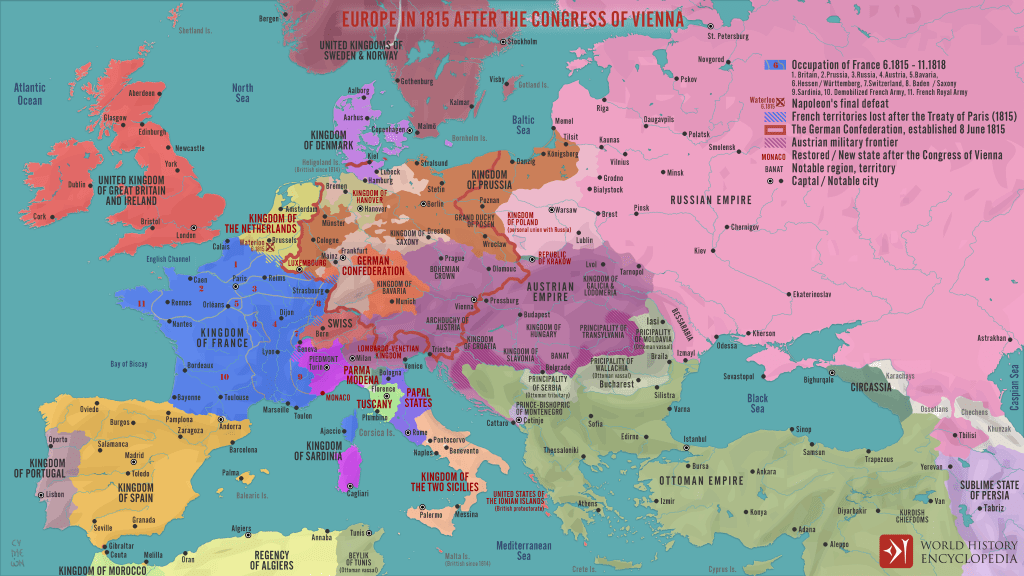 „За склапање трајног мира и ликвидацију последица Наполеонових ратова, сазван је био велики конгрес у Бечу. На том конгресу показала се јака противност у интересима савезника. У пролеће 1815. Европа се готово налазила пред новим, овог пута међусавезничким ратом. Спасило је Европу од те невоље бекство Наполеоново са острва Елбе. Његово искрцавање у Француској и одушевљени пријем у целој земљи, ујединили су савезнике.“