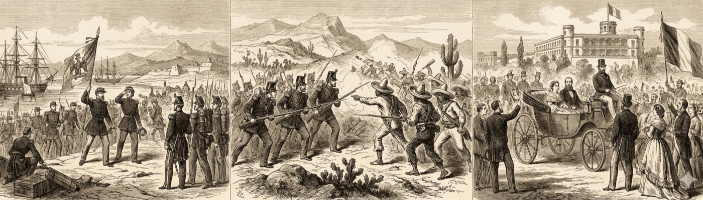 Мексико је дуго био поприште борбе између цркве и земљопоседника са једне, и антиклериканаца и радничке класе са друге стране. Радикали су однели победу у грађанском рату и 1860. на власт је дошао Бенито Хорес, који је наследио земљу осиромашену ратовањем и друштво захваћено анархијом. Године 1861. обуставио је исплату страних дугова. Француска, Велика Британија и Шпанија одговориле су потписивањем споразума којим су се обавезале да ће заједно интервенисати у Мексику искључиво да би заштитиле финансијске интересе својих грађана. Наполеон III имао је амбициозније планове од британске и шпанске владе. Скупина мексичких емиграната у Европи тражила је подршку неке од великих сила за оснивање монархије у Мексику и нашла ју је у Француској. Представник мексичке клерикалне партије успео је да заинтересује француску царицу Евгенију за своје идеје и освоји њене симпатије. Наполеон III, који се трудио да задовољи француске католике, оценио је да је Грађански рат у САД повољан тренутак за велики француски поход на Мексико. Ако би доведен католички принц либералних схватања било би заустављено ширење „англоамеричког варварства“ у Северној Америци. Енглеско-француско-шпанска експедиција заузела је Мексико 1861. године. Британске и шпанске снаге повукле су се 1862. године. Наполеон III је за мексички престо изабрао брата цара Франца Јозефа, Максимилијана Хабзбуршког.