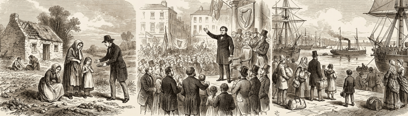 „Ирска је била европска земља коју је задесила најјача катастрофа XIX века, једини пример за негативан раст читаве једне нације у Европи. Велика ирска глад у периоду 1846-1852, која је уследила након веома брзог раста популације што је почео око 1780, прекинула је стари демографски образац. Глад, изазвана гљивичним обољењем кромпира, проузроковала је смрт најмање милион људи; то је био сваки осми становник Ирске. Емиграција, која је почела још раније, сада је попримила неслућене размере. Између 1847. и 1854. острво је годишње напуштало 200.000 људи. Током наредних деценија, број становника у Ирској опао је са 8.200.000 1841. на 4.500.000 1901. године. Томе је суштински допринела све каснија животна доб у којој се ступало у брак, што су подржавали свештенство и земљопоседници. У другој половини века, ирска привреда је доживела раст, што је суштински било последица емиграције. Као прво, порасле су реалне зараде земљорадника, као друго, Ирска је – попут нпр. Италије или јужне Кине – профитирала од слања финансијске помоћи. Стога су последице трагедије у неком погледу отклоњене након неколико деценија.“