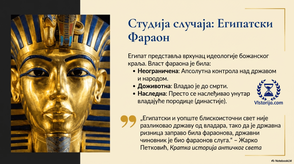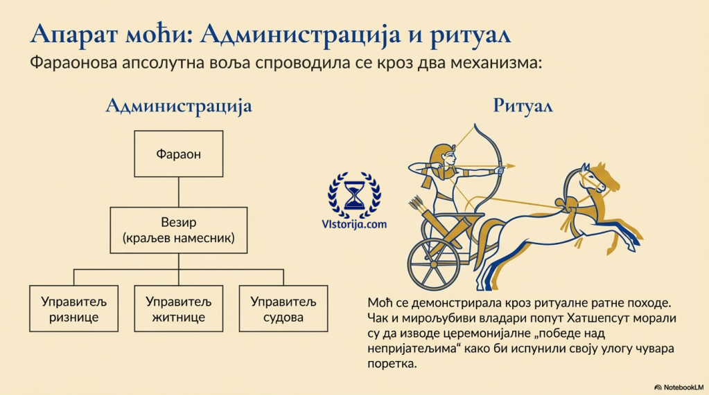 „Под фараоном се развијала државна управа, бројни његови управитељи и чиновници који су обезбеђивали да се спроводи његова воља, тј. да држава функционише. Египатски и уопште блискоисточни свет није разликовао државу од владара, тако да је државна ризница заправо била фараонова, државни чиновник је био фараонов слуга. Такав поглед на државу опстао је много векова касније, много година након пропасти античког, па и средњовековног света. На фараоновом двору постојао је везир, краљев намесник, одговоран једино њему, а ту су били и многи специјализовани управитељи: управитељ ризнице, житнице, судова итд.“