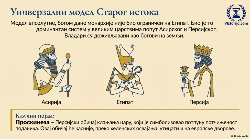 И у другим староисточним државама, као што у Асирско и Персијско царство, владари су имали монархијску (доживотну и наследну) и неограничену власт. Веровало се да власт царева произилази од воље богова. Поданици су их доживљавали као богове на земљи. У Персијском царству је настао обичај проскинезе – клањања цару, који је хеленским (грчким) освајањем Персије пренет на европске дворове.