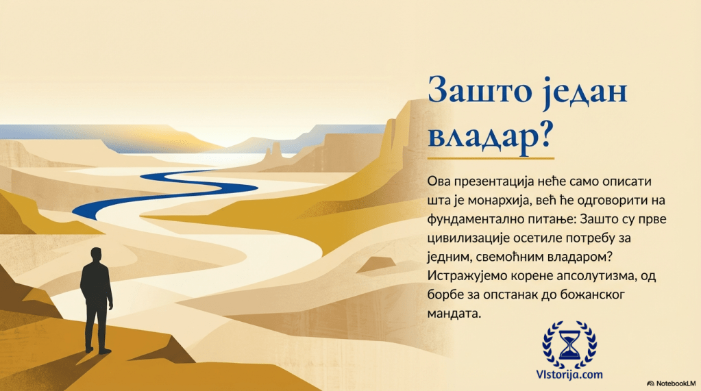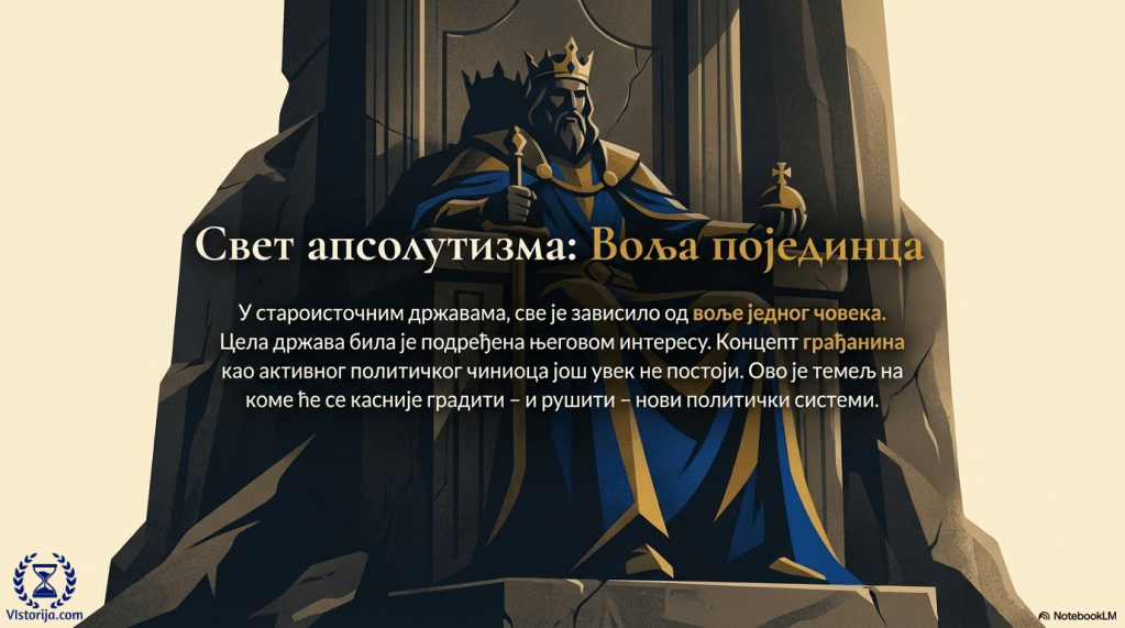 Старовековни апсолутни владари су били врховни свештеници, судије и војсковође. До поделе власти ће доћи много касније. Тек су у Хелади (Старој Грчкој) настали други облици владавине (олигархија у Спарти и демократија у Атини), а проћи ће још много векова пре него што први пут у некој држави власт монарха буде ограничена законом, када поданици схвате да могу да буду и активни политички чиниоци, тако што ће условити власт њиховом подршком. До тада ће све монархије бити апсолутне. У таквим државама све зависи од воље појединца и цела држава је подређена његовом интересу.