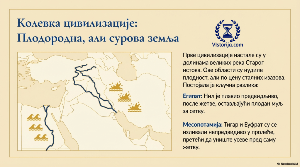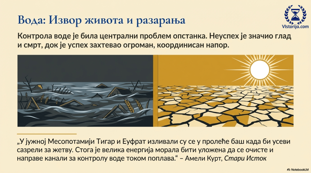 „Од суштинског значаја су висине годишњих падавина у области: на северу и западу (Турска, Левант, северна Месопотамија, северни Иран) пада довољно кише да би се усеви узгајали без потребе за редовним наводњавањем, али у јужној Месопотамији и Египту годишње падавине су веома ниске па стога пољопривреда у потпуности зависи од наводњавања из великих река. Али ту се сличност између две земље завршава; пре изградње велике асуанске бране Нил је плавио долину од средине јула до септембра, то јест, после жетве, а повлачио се управо у доба сетве; док су се у јужној Месопотамији Тигар и Еуфрат изливали у пролеће баш када би усеви сазрели за жетву. Стога је велика енергија морала бити уложена да се очисте и направе канали за контролу воде током поплава.“