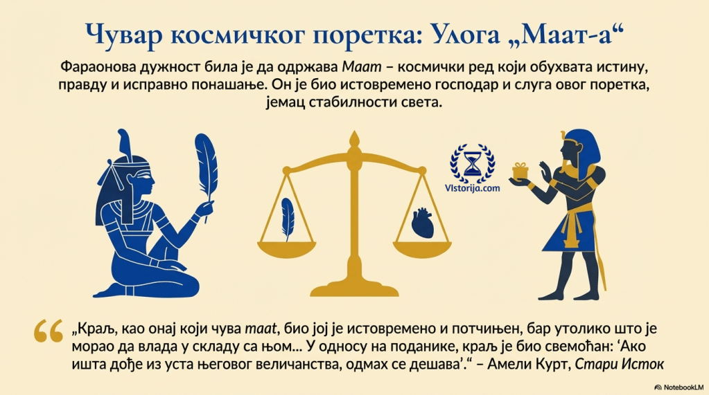 „Краљ је био оваплоћење свете моћи. Као такав, он је био јемац и бранилац космичког поретка чија је земаљска паралела била закон и поредак као што налаже успостављени status quo. Ово је било сажето у египатском појму maat, што је реч која обухвата склоп идеја попут „истине“, ,,исправног понашања“, ,,тачне равнотеже“. Краљ, као онај који чува maat, био јој је истовремено и потчињен, бар утолико што је морао да влада у складу са њом; иако га је вршење дужности такође аутоматски доводило у склад са космичким поретком. У односу на поданике, краљ је био свемоћан: ,,Ако ишта дође из уста његовог величанства, одмах се дешава“ (Urk 139, 13-14). Истовремено, он је зависно од богова и њихове добре воље. Премда је у извесном смислу и сам био бог, он није са њима делио свемоћ на свим равнима.“