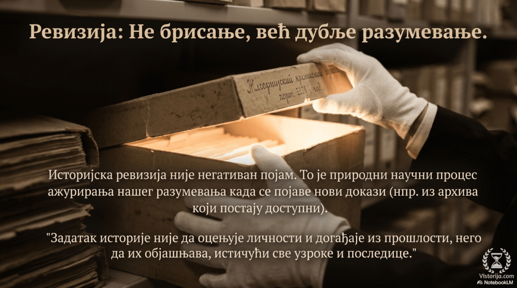 Ревизија историје је назив за драстичне промене у погледу вредновања одређених историјских збивања. Међутим, задатак историје није да оцењује личности и догађаје из прошлости, него да их објашњава, истичући све узроке и последице. Другачије сагледавање прошлости се јавља са истраживањем нових историјских извора, који временом постају доступни. Архиви су институције у којима се чувају документа са којима раде историчари. У библиотекама се чувају књиге, па и стручна литература за историчаре.