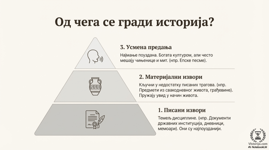 Сазнања о прошлости можемо стицати и на основу традиције, усмене традиције, која је у једном тренутку записана и утврђена. То је нарочито важно за историјске епохе или догађаје о којима немамо довољно правих сведочанстава, било да нису постојала или да нису сачувана. Традиција се природно мора излагати критици најчешће много пажљивијој него историографски извори; она доноси некада тачне податке, а некада је та „истина“ из народног предања прилагођена старим схватањима, а не модерним, научним. Тако у нашим епским песмама српску војску у Косовској битки предводи кнез Лазар (додуше, унапређен у цара), што је тачно, али њу и чине уз друге историјске личности и девет Југовића и стари Југ Богдан, заправо божанства из старе, прасловенске митологије. Треба дакле имати стално на уму: у истом тексту (у овом случају, у песми) тачност једног податка не гарантује тачност другог податка. Немогуће је историјским изворима, сложеним текстовима, давати једнозначни предзнак „тачан“ или „нетачан“.“