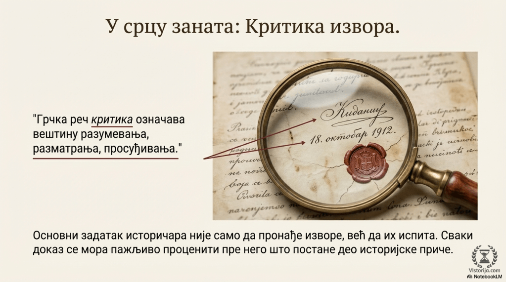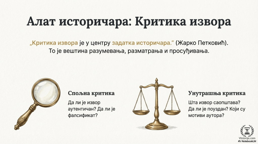 Ниједно схватање о прошлости није релевантно уколико није засновано на историјским изворима, али тачно протумаченим. Зато, иако се данас на интернету или у неким књигама може прочитати да су Александар Македонски или (и) цар Лициније били Срби или да се Срби нису населили на Балкан, већ да одувек ту живе, да су Срби зидали Вавилонску кулу, то није историја, већ машта, фикција, нечија лична жеља да то тако буде, погрешно уверење настало из неких разлога у које чак и не морамо улазити у овој прилици. Такве илузије не могу бити предмет ни расправе, пошто се не заснивају ни на једном историјском извору, иако се понекад маскирају позивањем на нечије неутемељено мишљење, као да је то мишљење историјски извор. Могу се позивати и на погрешно преведен или интерпретиран текст неког историјског извора, или се темеље на погрешном тумачењу тог текста. Притом, по правилу, љубопитљиви и неповерљиви људи који граде своја лична схватања о прошлости не познају ни језик историјског текста на који се позивају.