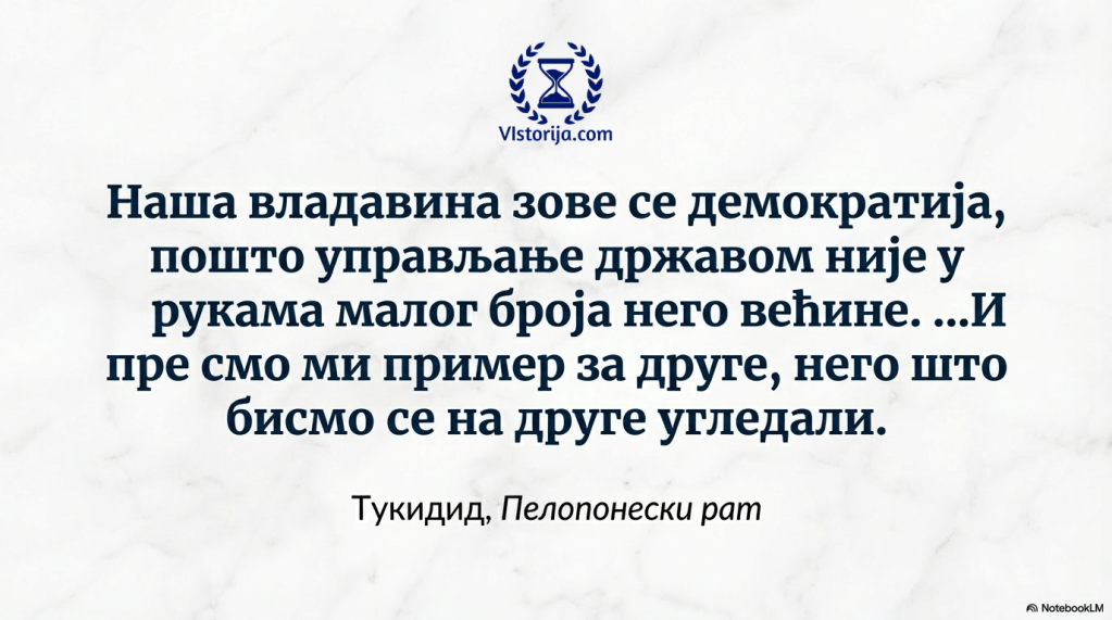 „Ми имамо такво политичко уређење које се не поводи за правним системима других држава. И пре смо ми пример за друге, него што бисмо се на друге угледали. А наша владавина зове се демократија, пошто управљање државом није у рукама малог броја него већине. Сви људи су што се тиче јавног живота, једнаки пред законом у погледу својих приватних парница. Међутим, свако ужива поштовање према заслузи и свако ће се бирати у јавне службе више због своје честитости него стога што припада неком одређеном друштвеном слоју. И нико се због свог сиромаштва и незнатног порекла не спречава да учини нешто корисно за државу, уколико то може.“
