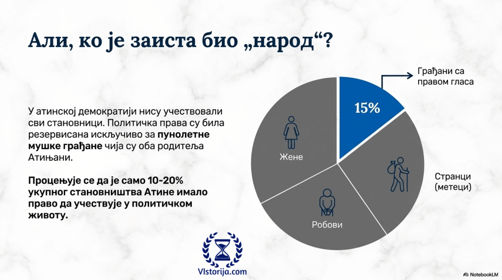 Иако је демократија сложеница грчких речи које значе владавина народа, у атинску демократију није укључена већина грађана. Политичка права нису имале жене, странци и робови, којих није било мало. Тако је у политичком животу учествовало само 10-20% Атињана.