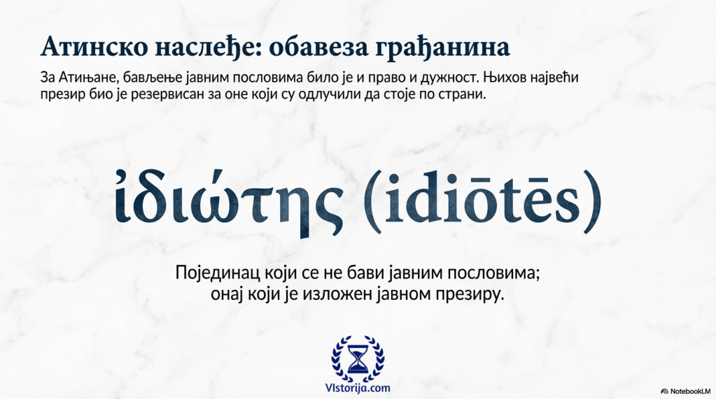 „Бављење политиком, јавним добром, јавним пословима, јавним интересом, судбином државе било је право, али и обавеза сваког грађанина (знамо већ, они који стоје по страни од јавних послова називају се идиотес, и изложени су јавном презиру).“