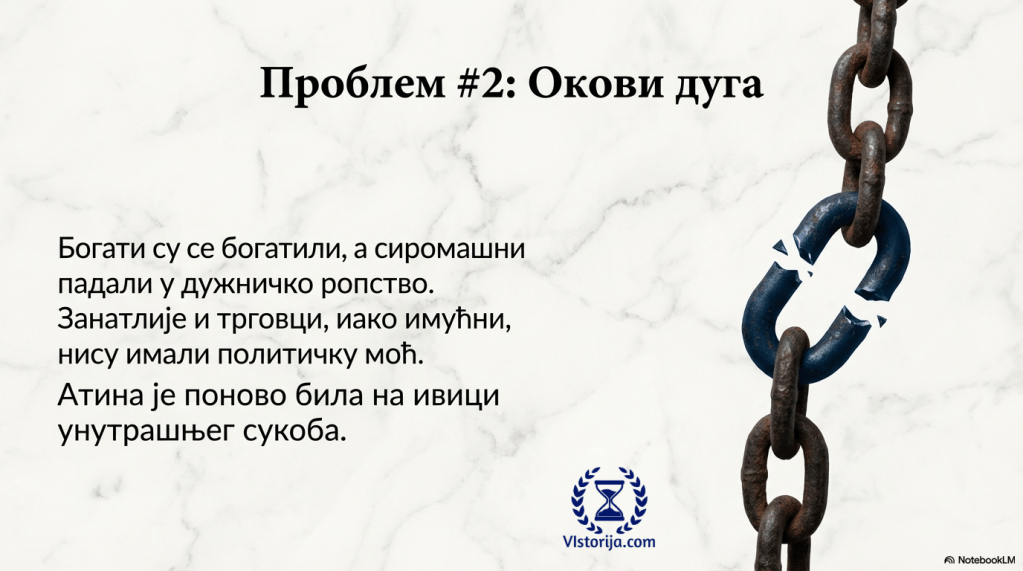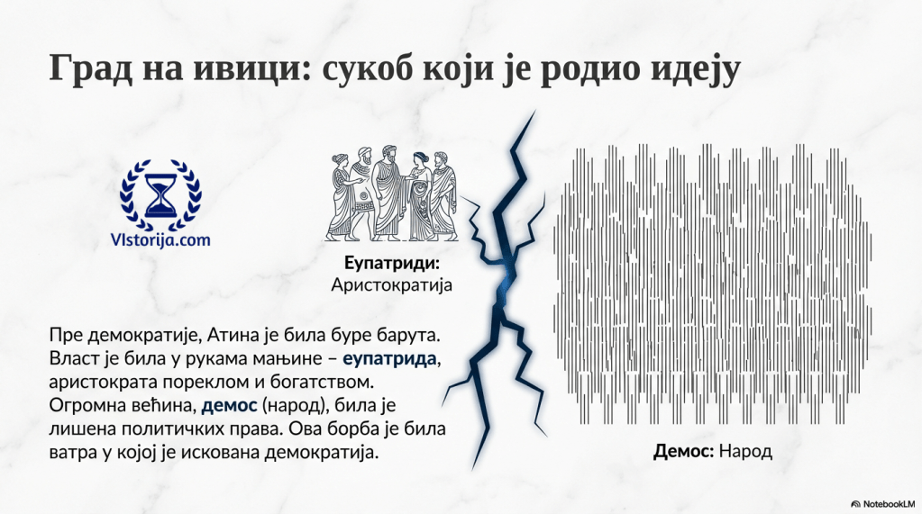 Припадници атинског демоса били су незадовољни својим положајем у држави. Људи који су се обогатили бавећи се занатством и трговином желели су да учествују у власти равноправно са еупатридима. Због тога су Атину често потресале политичке борбе. Из њих се родили ново државно уређење – демократија, у којем власт припада демосу (народу).