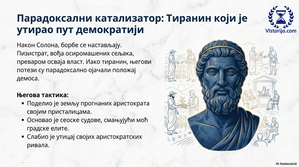 У политичким борбама након Соломонових реформи истакао се Пизистрат, који је предводио осиромашене атичке сељаке из унутрашњости. До власти се докопао преваром и насиљем. Ранио се и за то оптужио политичке противнике. Еклесија му је због тога доделила телесну стражу – људе наоружане батинама. Уз њихову помоћ Пизистрат је лако освојио атински Акропољ и власт у Атини средином VI века пре наше ере. Пизистрат је својим присталицама поделио земљу својих политичких противника који су побегли из Атине. Затим им је давао зајмове да би могли да живе од обрађивања земље. Установио је судове у сеоским општинама, да сељаци због тога не би морали да напуштају своја имања и одлазе у град. Сматрао је да ће, ако буду заузети свакодневни пословима, изгубити интересовање за политички живот. Атину је Пизистрат украсио многобројним храмовима. Побољшао је снабдевање града водом. У његово време су записани хомерски епови „Илијада“ и „Одисеја“. Пизистрат је умро 527. године, након чега су га наследила двојица синова. Због сурове власти њихова тиранија је постала омражена у Атини, те су их збацили са власти.