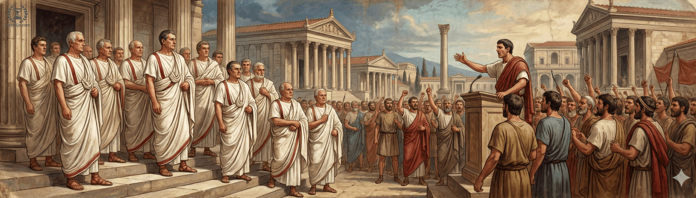 Већина, обични плебејци су тако били социјално супротстављени владајућем патрицијима. Обичном народу недостајала је и земља, тако је један од сталних плебејских захтева била и додељивање земље, освојене у ратовима. Дакле, борба плебејаца за политичка права, одвијала се уз њихову борбу за бољи социјални статус. У тој борби, плебејци су имали једно доста ефикасно средство да притискају патрицијску елиту. Наиме, без њиховог учешћа, римска војска била би незамислива; патриција једноставно није било довољно да би римска држава ратовала. Побуне, које су, у ствари, представљале одбијање плебејаца да узму оружје и учествују у војним походима, узроковале су то да су патрицији под притиском пристајали на уступке. Један од најранијих и најзначајнијих уступака била је једна плебејска магистратура, тј. плебејски трибунат, успостављен петнаестак година након протеривања краљева. Плебејски трибун је штитио плебејце од злоупотребе магистрата на суду, као и од права магистрата да спроводи силу ван суда. Дакле, трибун је штитио имовину и личност плебејеца. С временом, плебејски трибунат се мењао и постао је најважнији гарант слободе римског народа. Трибуни су наиме имали право да спрече сваки акт магистрата, као и да спрече доношење закона (уложе „вето“ – забрану) уколико би он био, по њиховој процени, против плебејских права. […]