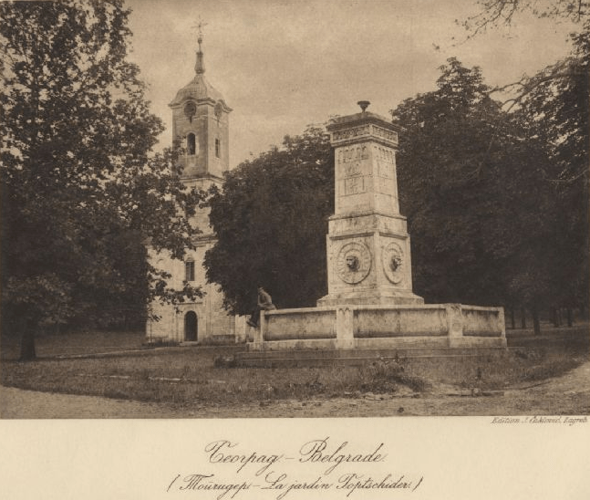 „На њој на све четири стране стоји натпис М. О. -I- 1860. Пренета је у Топчидер 1904 […] Пре ове чесме, на истом месту, била је стара чесма коју су, не зна се кад, Турци подигли. То је била неугледна чесма.“