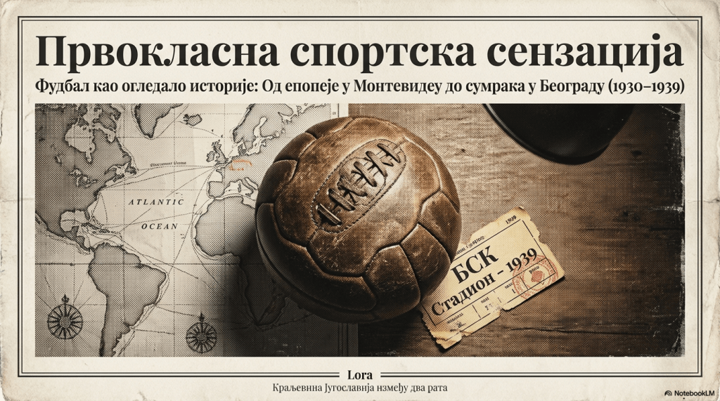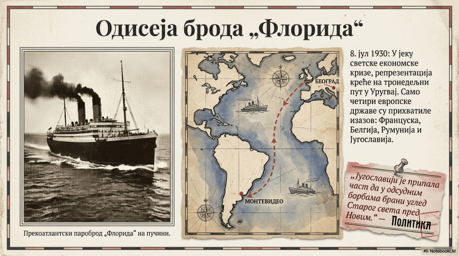 „Осмог јула 1930, у сред светске привредне кризе, југословенски фудбалски тим искрцао се у Монтевидеу, после тронедељне пловидбе на броду „Флорида“. Претходне године светски фудбалски савез ФИФА одлучио је да организује светско првенство на сваке четири године. После дугог натезања, избор је пао на Уругвај да буде земља домаћин. Међу разочараним Европљанима, само четири државе су пристале да пошаљу своје најбоље играче на другу страну света: Француска, Белгија, Југославија и Румунија. Учешће у првенству није било само у вези са спортом, рекао је потпредседник југословенског фудбалског савеза Коста Хаџи већ и са радним мигрантима и промоцијом Југославије. Масе навијача са заставицама приредиле су тиму импресиван дочек. Док су Румуни испали из такмичења већ у првој рунди, југословенски тим је успео да победи Бразилију и Боливију и да стигне до полуфинала, али је тамо био потучен са 6:1 од каснијег светског шампиона, Уругваја. Код куће, где је „у свима кафанама, у свима кућама, главни…, може се рећи и једини разговор био утакмица“, људи су ипак били поносни. Успех је био утолико важнији, писао је дневни лист Политика, што је Југославији припала част да у одсудним борбама брани углед Старог света пред Новим.