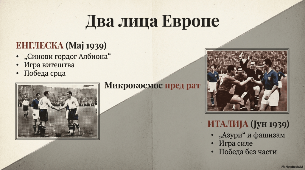 „Маја 1939. године у Београду је гостовала фудбалска репрезентација Енглеске. Она се 18. маја састала, у пријатељском мечу, са изабраним тимом Југославије. Најбољи фудбалери са Острва први пут су играли у нашој земљи. Важили су за највеће светске мајсторе фудбалске лопте, иако ниједном нису учествовали на светским фудбалским шампионатима. Они су, једноставно, чекали да се светско првенство заврши, а онда се од играча светског првака и остатка света сачинила репрезентација, која се састала са најбољом једанаесторицом Енглеске. Наравно, фудбалери са Острва су редовно убедљиво побеђивали, доказујући да су најбољи на свету…