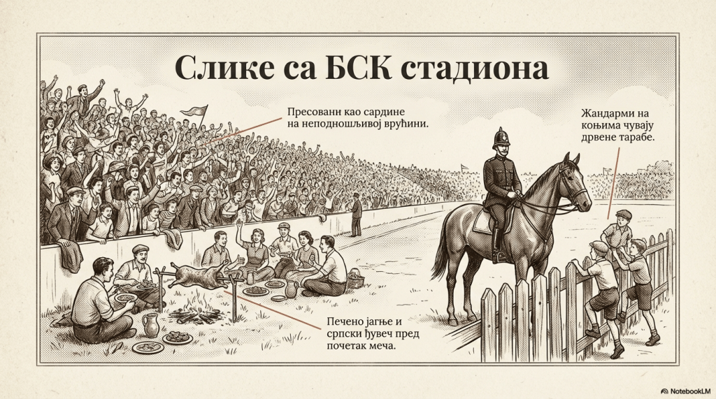 „Стадион БСК-а, који је могао да прими око 25.000 гледалаца, био је ограђен тарабама, а сам терен већим делом покривен травом. Иначе, већина игралишта није имала травнате терене. Пред почетак утакмице, са спољне стране игралишта испред тараба, патролирали су жандарми на коњима са повеликим пендрецима у рукама. Њихов задатак био је да пендрецима интервенишу да неко, најчешће дечаци, не прескочи преко тарабе и бесплатно посматра утакмицу. Иза тараба, у игралишту, шеткали су се „чувари“ са батинама у рукама, будно мотрећи да неко ипак не умакне жандармима и не прескочи плот. Иако је обезбеђење било двоструко, омладинци су редовно покушавали да савладају препреке, понеки је и успео, други су модрицама плаћали храброст.