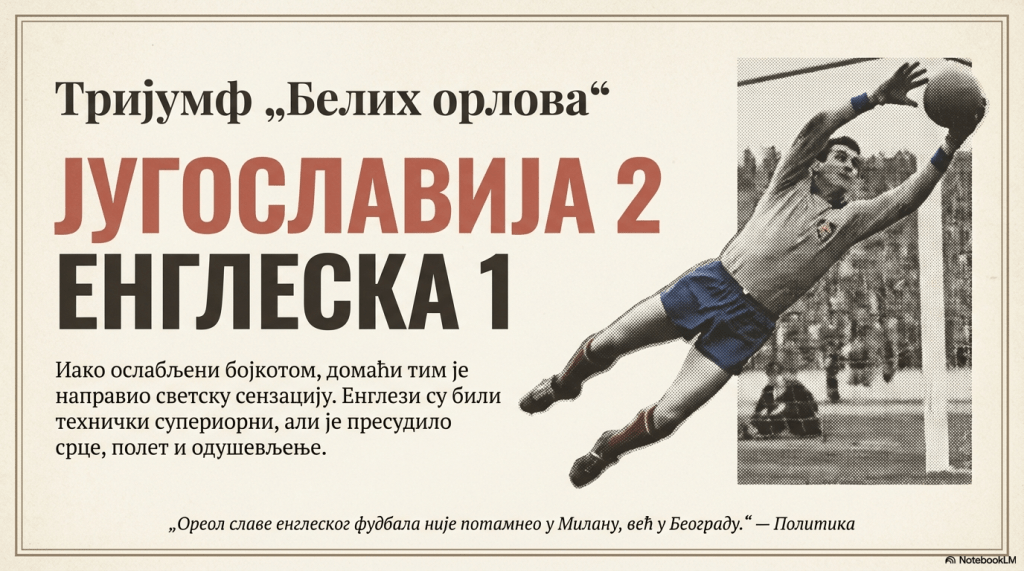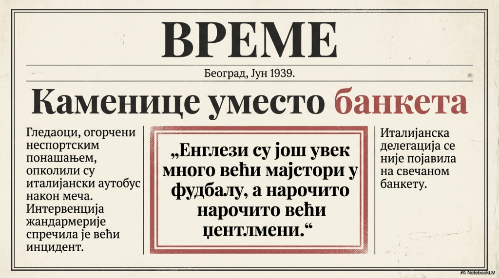 Оно што Италијани, званични прваци света нису могли да учине приликом гостовања Енглеза прешле суботе у Милану, учинили смо ми, Југословени. Ореол славе енглеског, футбала није потамнео у Милану, у Италији, већ у Београду, престоници Југославије.“