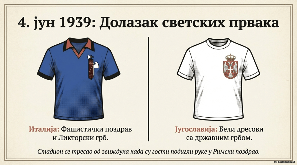 „Две недеље после победе над Енглеском, 4. јуна, репрезентација Југославије састала се са званичним прваком света Италијом (титула освојена 1938. године). Репрезентација Италије играла је први пут у Југославији. Интересовање за овај меч било је, чини ми се, и веће него за утакмицу са Енглезима. На крају, Италијани су били званични светски шампиони. Љубитељи фудбала, одушевљени успехом у мечу са Енглезима, надали су се још једној великој победи. И Италијани су били веома заинтересовани за ову утакмицу била је то за њих прилика да се победом над Југославијом рехабилитују за нерешену игру са Енглезима у Милану (2:2 недељу дана пре гостовања британских фудбалера у Београду).