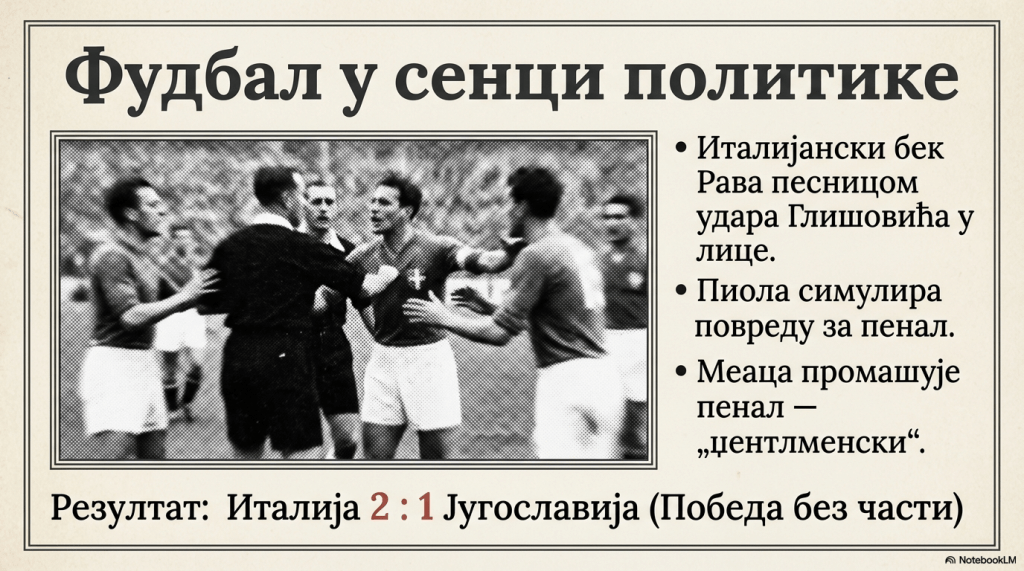 Италијани су очекивали лаку победу. Међутим, наши фудбалери су се изванредно борили. Светски првак је само једном у првом полувремену погодно нашу мрежу. А кад су Италијани у другом делу утакмице постигли још један погодак и кад је изгледало да ће ипак лако тријумфовати, наш тим, громогласно бодрен од гледалаца, заиграо је изванредно и успео да смањи резултат на 2: 1. Италијани су се грчевито бранили. У једном тренутку се њихов леви бек Рава заборавио и без икаквог разлога песницом ударио у лице наше десно крило Глишовића. Стадион се тресао од звиждука и протеста, љубитељи фудбала били су огорчени. Судија утакмице Белгијанац Лангенус није уопште реаговао на испад италијанског играча. Нешто касније начинио је још једну грешку: италијански центар навале Пиола вешто је у једном тренутку пао у нашем шеснаестерцу, симулирао повреду и арбитар је досудио једанаестерац. Италијански играчи окупили су се око Пиоле, који је лежао на земљи. Дотрчао је и савезни капитен Италије Поцо. Прекид је трајао више од десет минута. Судија није за толико продужио игру. Гости, истина, нису искористили најтежу казну. Меаца је промашио гол. Али све то није умирило гледалиште. Поготово што је утакмица завршена десетак минута раније, у тренуцима кад је наш тим жестоко нападао и био близу изједначења…