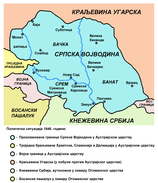 Током револуционарне 1848/49. године Срби су покушали да сарађују са Мађарима, који су искористили немире у Бечу да затраже независност. Мађари нису били спремни на националне уступке Србима. Након тога Срби су се ослањали на двор у Бечу. На Мајској скупштини (од 1. до 3. маја по старом календару) 1848. године у Сремским Карловцима је проглашено формирање Српске Војводине и изабрани су патријарх Јосиф Рајачић и војвода Стеван Шупљикац. Из Србије су стизали добровољци, које је предводио Стеван Книћанин.