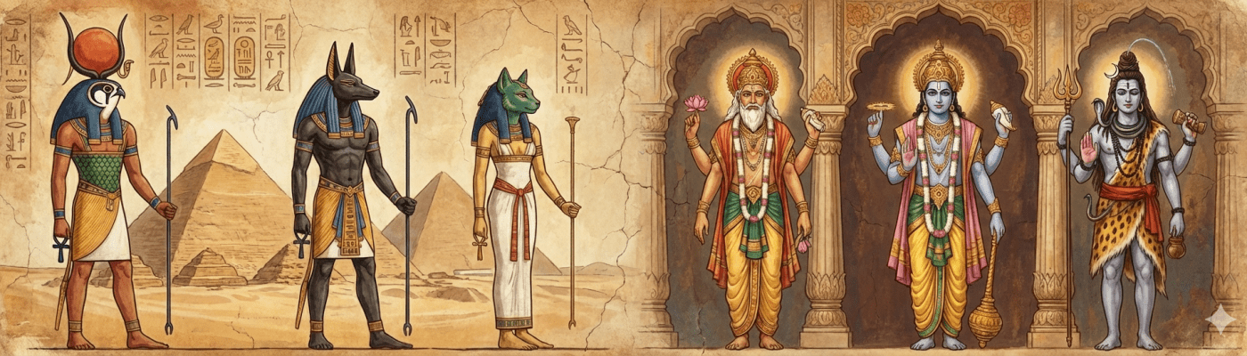 Египћани су своје богове најчешће представљали кроз комбинацију људских (антропоморфних) и животињских (зооморфних) црта. Обично су имали људска тела и животињске главе – оних животиња које су сматране пратиоцима датог божанства.“
