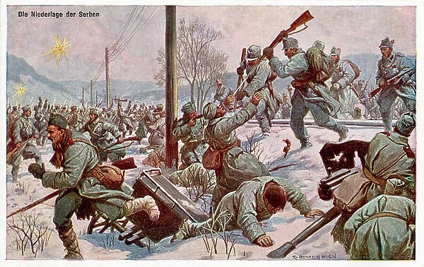 Пошто су Централне силе успеле да на своју страну привуку Бугарску, немачке, аустро-угарске и бугарске трупе поново су умарширале у Србију у октобру 1915. године. Месец дана касније престале су велике битке, али та балканска држава још није капитулирала.“