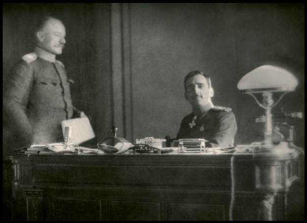 Регент Александар Карађорђевић и војвода Живојин Мишић у Штабу Врховне команде српске војске. Фотографисао Риста Марјановић 1918. године.
