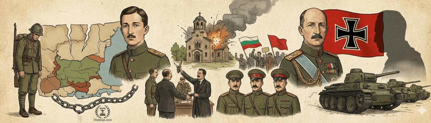 „Шеснаестог априла 1925. године у Саборној цркви у Софији експлодирала је бомба за време службе, којој је требало да присуствује и краљ. Он је закаснио, па се захваљујући томе спасао, али је четворо људи погинуло а преко 300 је рањено у претрпаној цркви. Установљено је да су за злочин одговорна двојица комуниста, мада су они изгледа деловали без наређења партије. Поново је дошло до масовних убистава, која су већином вршиле македонске чете, мада су нека била и дело званичне полиције. Следећи потрес изазвао је грчки упад у јужну Бугарску у октобру 1925. године, после низа пограничних немира. У тај случај умешала се Лига народа и приморала Грке да се повуку и плате одштету.“