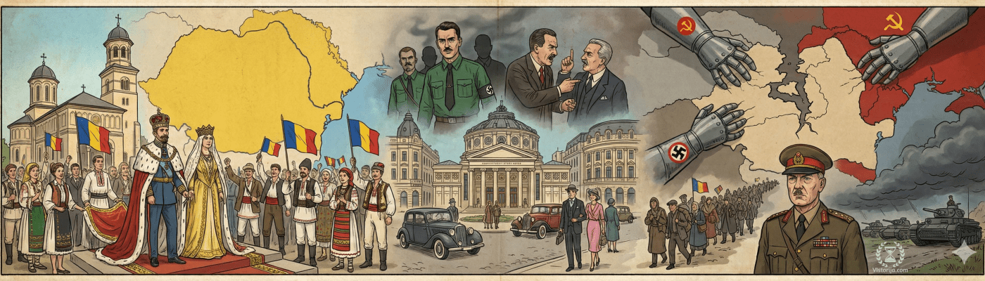 „Тиме што се придружила савезницима у Првом светском рату, упркос немачкој инвазији и окупацији, Румунија је у Паризу богато награђена. Добила је не само Трансилванију, већ и Буковину и делове Баната од Аустроугарске, и Бесарабију од Русије. Румунија је више него удвостручила територију и становништво, чиме је добила плодне пољопривредне области, као и индустријализовану територију и области богате природним ресурсима. Тако поново видимо изванредан потенцијал. Али као и у Југославији, у послератној Румунији политичари – људи деветнаестог века који покушавају да функционишу у свету двадесетог века – нису увидели да сада пред собом имају сасвим нову државу, са многобројним мањинама, а не само увећану верзију старе Румуније.“