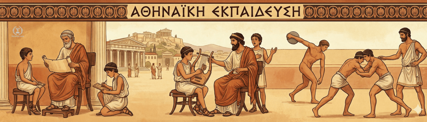 „Широко распрострањена писменост указује на широко распрострањено школство. О организованим школама први пут чујемо на крају 6. века. Образовање је плаћено, али je цена морала бити мала, с обзиром на то да су учитељи презирани. Атински закони су прописивали радно време школа [не пре зоре и не по мраку] и узраст дечака који су се у њу могли уписати, а установљен је и државни надзор над учитељима, очигледно ради моралне заштите деце од учитеља; оне који су то себи могли да приуште у школу је пратио роб. Школовање је почињало са седам година и за многе сигурно није трајало дуже од три или четири године, колико је било потребно да се савладају основне вештине. Међутим, ако узмемо у обзир да се сматрало да следећа животна фаза почиње око осамнаесте године, можемо да претпоставимо да су многи имали и свих десет година школовања. Образовање се традиционално делило на три области, под надзором три различите врсте учитеља: књижевност, физичко васпитање и музика.“