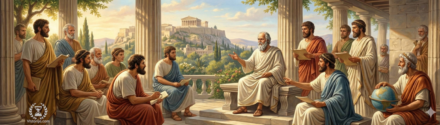 Филозофијом се у антици називало целокупно знање. Сама реч на грчком значи „љубав према мудрости“. Филозофија у данашњем смислу настала је у Грчкој у VI веку пре наше ере. Првим правим филозофом сматра се Талес из Милета у Малој Азији, уз чију обалу је острво Самос, одакле је и Питагора, који је своју делатност наставио у Кротонеу, на југу Италије, где је основао филозофску школу и први употребио појам филозофија. Најпознатији је по математичкој теореми, бавио се и теоријом музике, а први је који је тврдио да је Земља округла. Живео је у другој половини VI и почетком V века пре наше ере. У V веку су деловали софисти, филозофи који су били и путујући учитељи, који су предавања држали за новац.