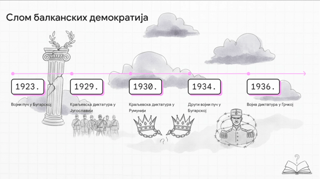 Међутим, већина земаља југоисточне Европе кренула је пут ауторитарних система већ и пре него што је светска привредна криза у потпуности показала своју деструктивну снагу. Конзерватнивно-националне снаге никада нису потпуно прихватиле основно опредељење за парламентаризам, демократију и грађански поредак из 1918. године. […] Државе југоисточне Европе једна за другом су напуштале парламентарни систем.“