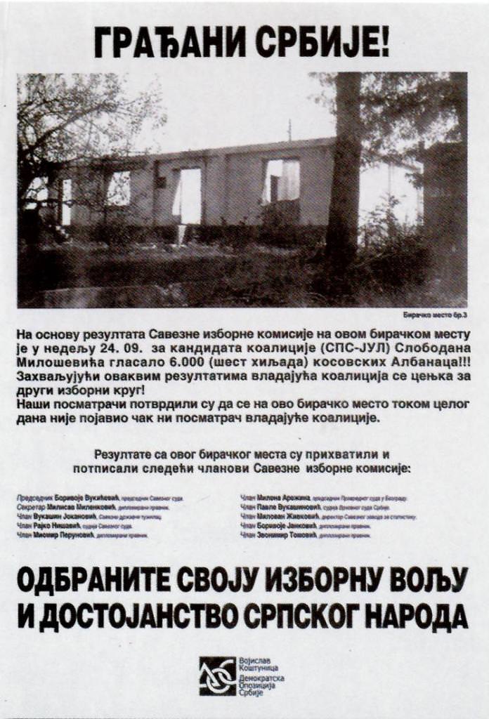 „Погледамо ли изборни исход, прво што пада у очи је да су снаге опозиције, ДОС и СПО, убедљиво победиле снаге режима, СПС и СРС. Освојиле су око 400.000 гласова више на скупштинским, и преко 500.000 гласова више на председничким изборима. Ипак, међу снагама опозиције постојао је само један победник. То је био ДОС. Некада најјача опозициона странка, СПО, претрпела је тежак пораз. Изгубила је две трећине ранијих гласова, и са 19% пала на неких 6% гласова бирача. Исту судбину, у режимском блоку, доживели су радикали. Са 28% гласова они су спали на 10% (на председничким изборима чак на 6%!).“