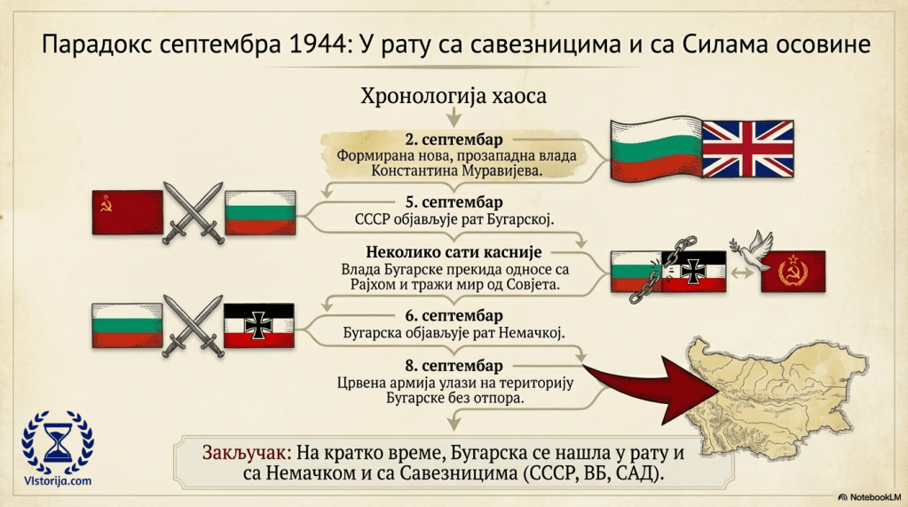 У Бугарској је 2. септембра 1944. године била састављена нова влада, која је после дужег времена била постављена на вишестраначкој основи, прозападне оријентације, на челу са Константином Муравијевим. Георги Димитров није веровао у могућност да та влада објави рат Немачкој, чиме би постала совјетски савезник, али Москви, с обзиром на чињеницу да се Црвена армија налазила у Румунији, више није ни била потребна кооперативна влада у Софији. Совјетски Савез је 5. септембра 1944. објавио рат Бугарској, прекинувши дипломатске односе. Неколико сати по објави рата, бугарска влада је прекинула дипломатске односе са Рајхом и затражила мир од Совјета, а сутрадан је објавила рат Немачкој, нашавши се тиме на кратко време у рату и са Немачком и са Савезницима. Црвена армија је на територију Бугарске ступила 8. септембра, пружајући својим присуством подршку припремљеном државном удару и учествујући активно у првим данима освајања власти.