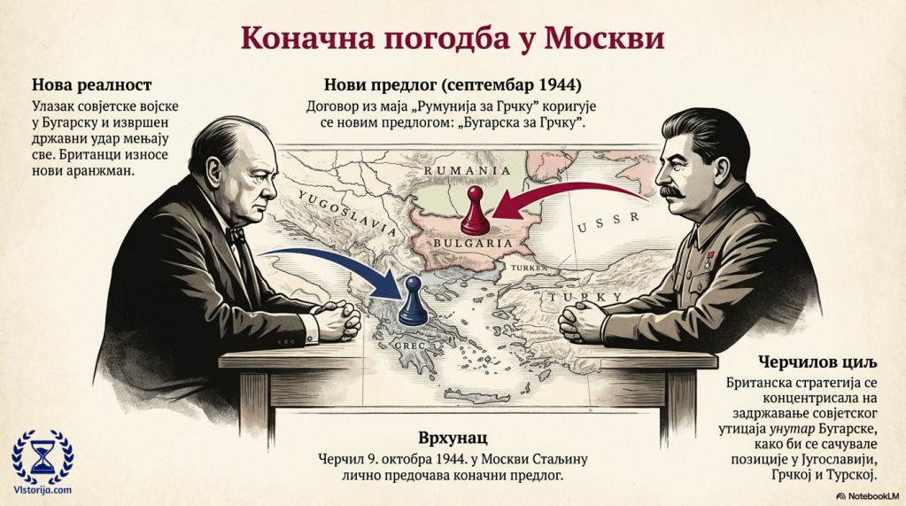 Услед чињенице да је совјетска војска ушла на територију Бу-гарске и да је у Софији био извршен државни удар, Британци су у септембру 1944. године пред Совјете први пут изнели нови аранжман поделе утицајних сфера: договор из маја-јуна „Румунија за Грчку“ био је коригован новим предлогом „Бугарска за Грчку“. Ентони Идн је ипак још у јуну схватио да ће Бугарска вероватно припасти Совјетима, па се британска администрација концентрисала на израду стратегије задржавања Совјета у Бугарској јер су Британци морали своје позиције сачувати у Југославији, Грчкој и Турској. Коначни предлог британско-совјетске нагодбе Стаљину је био предочен у Москви 9. октобра 1944, када му је Черчил понудио процентуалну поделу Балкана, и у оквиру ње, поделу Бугарске: 75%-25% у корист Совјета.“
