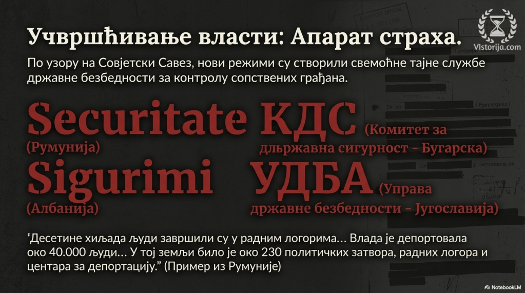 Током наредних година, комунистички режими су радили на утврђивању власти по узору на Совјетски Савез. Створили су тајне службе, односно, службе држав не безбедности са мрежом агената, која се могла употребити не само против непријатеља у иностранству, већ нарочито против сопствених грађана: румунска Securitate, бугарска КДС, албанска Sigurimi и југословенска УДБА. У првим послератним годинама у Румунији су десетине хиљада људи завршили у радним логорима за преваспитавање непријатеља републике“.“ Влада је депортовала око 40.000 људи, обележених као „ризични за безбедност“, у један 25 км дуг појас дуж границе са Југославијом. У тој земљи било је око 230 политичких затвора, радних логора и центара за депортацију, петнаест психијатријских завода и деветнаест губилишта. Док је у свим државама комунистички терор престао 1950-их година, у Албанији су „чистке“ биле честе и изненадне још дуго после рата. Једино је Енвер Хоџа од свих припадника генерације оснивача комунистичких партија, преживео све таласе прогона.