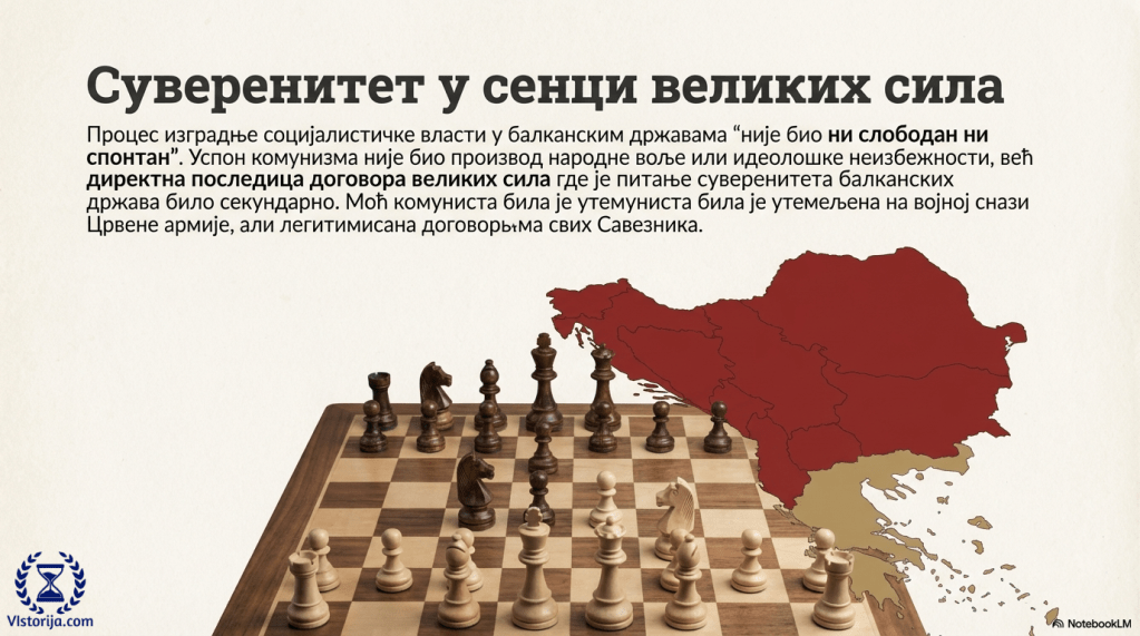 „Велике жртве које су Европљани поднели током Другог светског рата, морале су, по његовом окончању, да добију неки смисао и оправдање. Нови међународни поредак који је проистекао из са везничких договора требало је да буде гарант послератне равнотеже снага у свету, односно гарант мира на дужи период. У том смислу, постављање нових послератних структура власти у целој Европи представљало је најважније питање међународне заједнице и то је био први предуслов и најшири контекст за њихову изградњу на Балкану. Другим речима, процес и динамика изградње социјалистичке власти у балканским државама, условљени окончањем светског сукоба и уласком Савезника у Хладни рат, нису били ни слободни ни спонтани, а начин на који су били спроведени проблематизује питање суверенитета балканских држава.