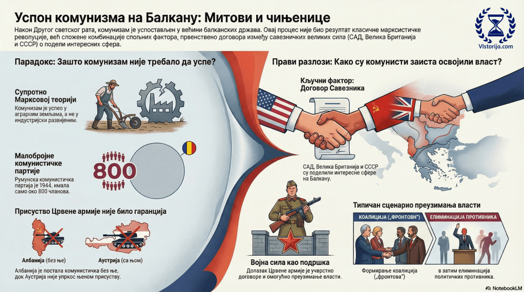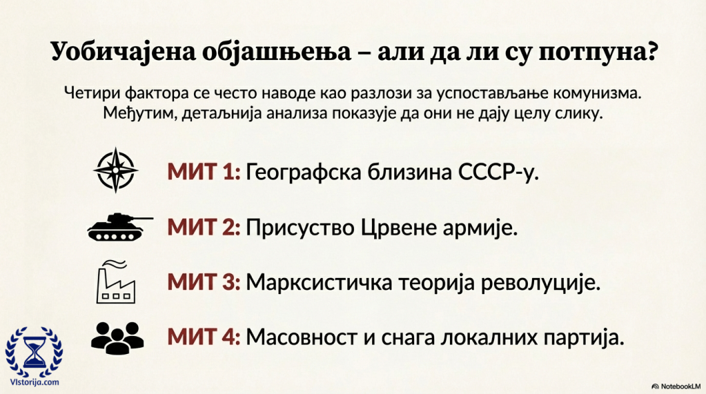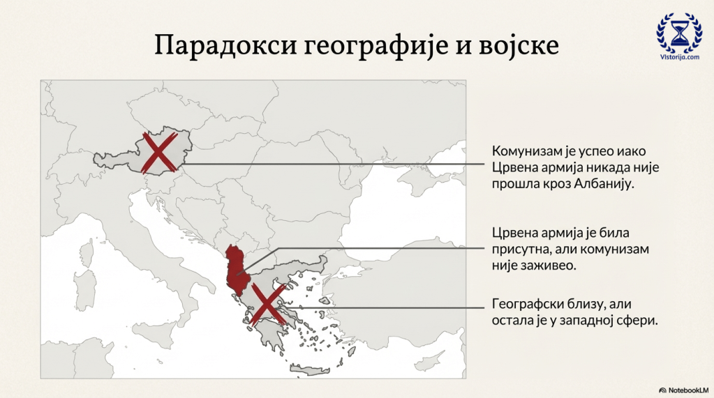 „Као разлози за увођење комунизма, односно социјализма, у земље Источне Европе, у литератури се наводе два фактора: њихова близина СССР-у и присуство Црвене армије на њиховим територијама. Што се тиче близине, односно удаљености источноевропских земаља од СССР-а, то објашњење само је делимично тачно. Демантују га примери удаљене Албаније, у којој је „комунизам“ успео, иако у СССР-у ближим земљама, попут Грчке или Аустрије, ипак није заживео. Ни присуство Црвене армије није био гарант успостављања комунизма“. На пример, Црвена армија никада није прошла кроз Албанију, али је социјализам тамо био подигнут на ниво званичне државне идеологије, док кроз Аустрију трупе Црвене армије јесу прошле, и задржале се, али се у тој земљи никада није развио социјализам стаљинистичког типа.