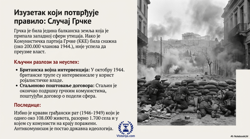 У Грчкој су комунисти такође вероватно могли да се одрже, као у Југославији и Албанији, да британске трупе нису у октобру 1944. интервенисале у корист ројалистичке владе у егзилу. Када се краљ Ђорђе II 1946. вратио у земљу, избио је крвави грађански рат између комуниста и присталица старог поретка. До 1949. је око 108.000 људи избугило живот у борбама, репресалијама и масовним егзекуцијама. Разорено је 1700 села, стотине хиљада људи су отерани из својих домова и прогнани. На крају су комунисти били поражени, и антикомунизам је постао државна идеологија.