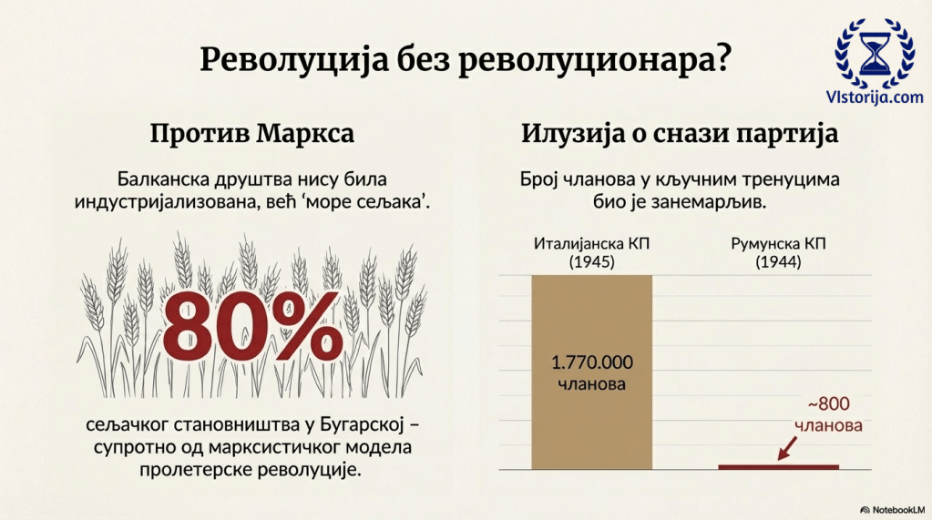 Ни величина комунистичких партија у европским земљама није била пресудан фактор за успостављање социјалистичких система у њима. Судећи према фактору масовности партије, далеко веће шансе за избијање револуције постојале су у западноевропским државама које су имале снажне комунистичке партије. Примера ради, 1939. године шпанска партија је имала 300.000 чланова, француска 270.000, чехословачка 60.000, шведска 19.000, британска 18.000, холандска 10.000, белгијска 7.000 чланова. Грчка комунистичка партија је крајем 1944. године имала око 200.000 чланова, а италијанска партија је 1945. године имала 1.770.000 чланова. Стаљин је, међу тим, знао да у западноевропским земљама, упркос развијеним комунистичким партијама у њима, није могао придобити раднике за свој антиимперијалистички програм, јер су радници знали да радна места имају управо захваљујући чињеници да живе у колонијалним силама. Присталице антиимперијализма је, са друге стране, могао наћи међу Балканцима. Па ипак, невероватним се може чинити податак да је око 800 партијаца, колико је у августу 1944. године, на пример, имала Румунска комунистичка партија, успело да освоји и одржи власт у тој земљи све до 1989. године. Слично је било и у Албанији, у којој је комунистичка партија такође спадала у ред најмањих.“