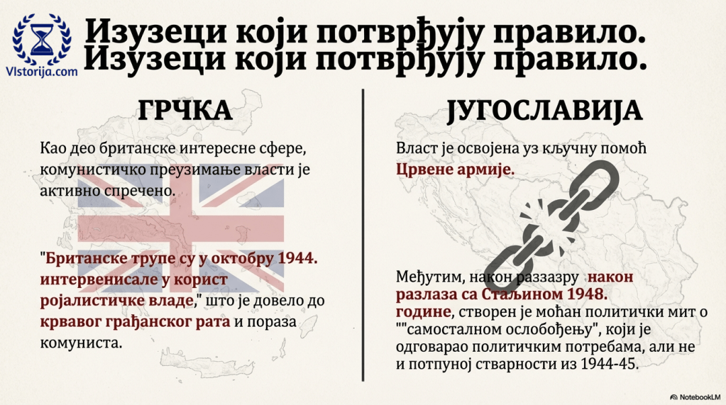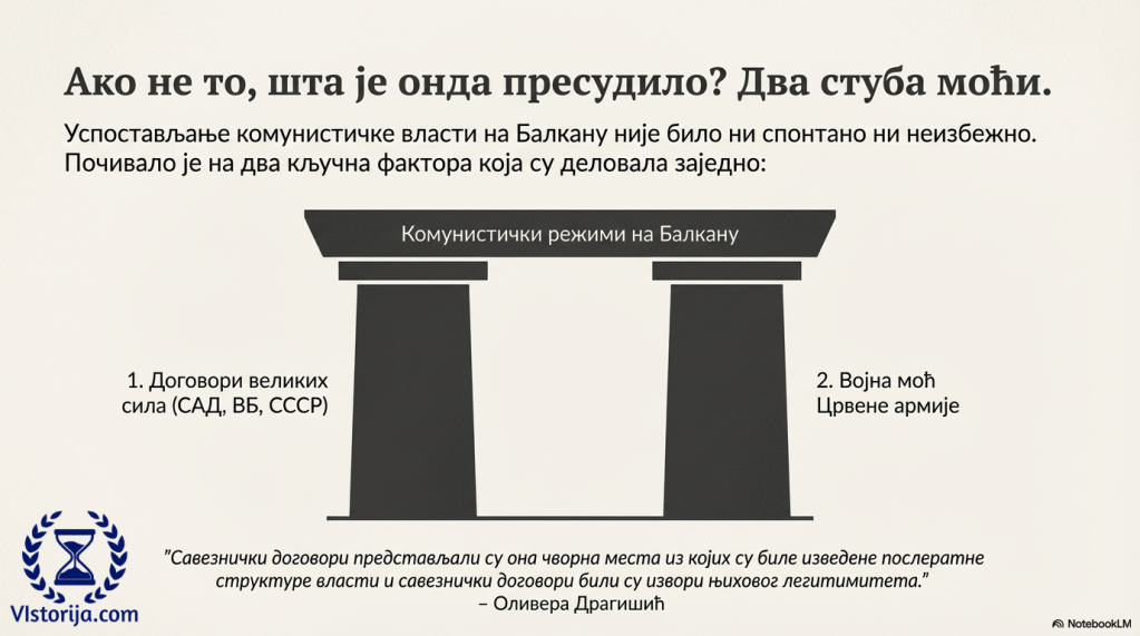 Суштински, моћ послератних властодржаца, комуниста, била је утемељена на војној снази Црвене армије и Титових партизана (и на њиховом сусрету у Србији), али ни то не би било довољно да се кретање армија или њихово прерастање у респектабилне војне формације није одвијало на фону савезничких договора. Савезнички договори представљали су она чворна места из којих су биле изведене послератне структуре власти и савезнички договори били су извори њиховог легитимитета.“