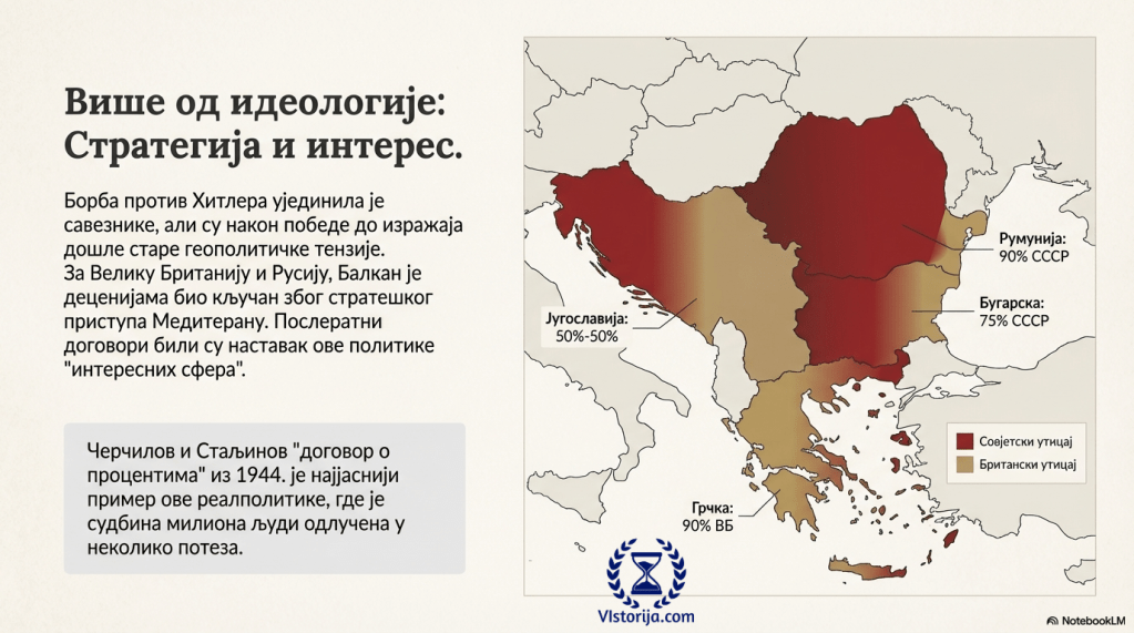 Американце и Британце је са комунистичким Русима спојила борба против Хитлерове Немачке. Када је заједнички непријатељ побеђен, до изражаја су дошле дубоке идеолошке разлике ратних савезника. На Балкану су Британци и Руси долазили у конфликтне ситуације око поделе интересних сфера још од 19. века. Балкан им је, заправо, био значајан због приступа Медитерану. Већа војна сила многољуднијег СССР-а је била пресудна у подели интересних сфера на Балкану после Другог светског рата. Договорени утицај савезници су планирали да спроведу преко постављања себи оданих власти у балканским државама.