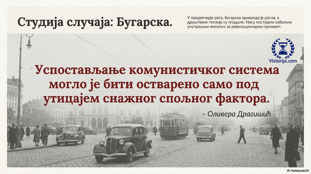 Из перспективе марксистичке теорије, шансе за радикалне друштвене и политичке промене у источноевропским и балканским државама, па и у Бугарској у предвечерје рата – нису постојале. Према Марксовој теорији, револуције су се могле одиграти у земљама изражених друштвених противречности, па су се драстичне промене можда и могле очекивати у западним европским друштвима, али у Бугарској, која је била изразито аграрна земља, са слабо развијеном индустријом и ниском концентрацијом капитала, револуција се није могла очекивати. Штавише, у другој половини тридесетих година Бугарска је изгледала као земља у којој је привреда расла, а политички живот се, иако ауторитаран, у поређењу са периодом после Првог светског рата, стабилизовао, чиме су друштвене тензије знатно ослабиле. Ни потписивање пакта са Хитлером 1. марта 1941. године такву ситуацију у почетку није променило. До краја рата у Бугарској нису постојали озбиљни унутрашњи политички, друштвени и економски импулси који би бугарско друштво спонтано довели до револуционарног преокрета. Успостављање комунистичког система могло је бити остварено само под утицајем снажног спољног фактора.“