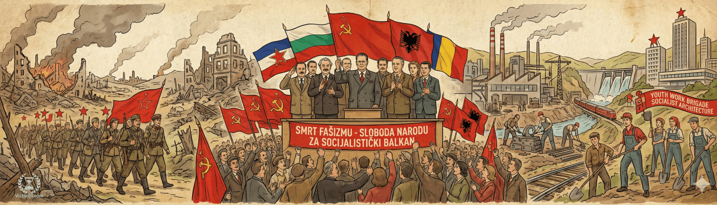 У атмосфери опште несигурности и насиља одржавани су парламентарни избори, на којима су комунистичке партије освајале огромну већину гласова. Оне су једна за другом проглашавале социјалистичке „народне републике“: Југославија крајем 1945, Албанија и Бугарска 1946. и Румунија 1947. Те земље су добиле уставе, јако ослоњене на совјетски модел, али су ипак биле централистички устројене. Једино је Југославија постала федерација шест република и две аутономне покрајине. Као државотворни народи признати су Словенци, Хрвати, Срби, Македонци и Црногорци, а 1960-их и босански Муслимани. Одбачена је идеја о јединственој југословенској нацији, каква је постојала у међуратном периоду.“