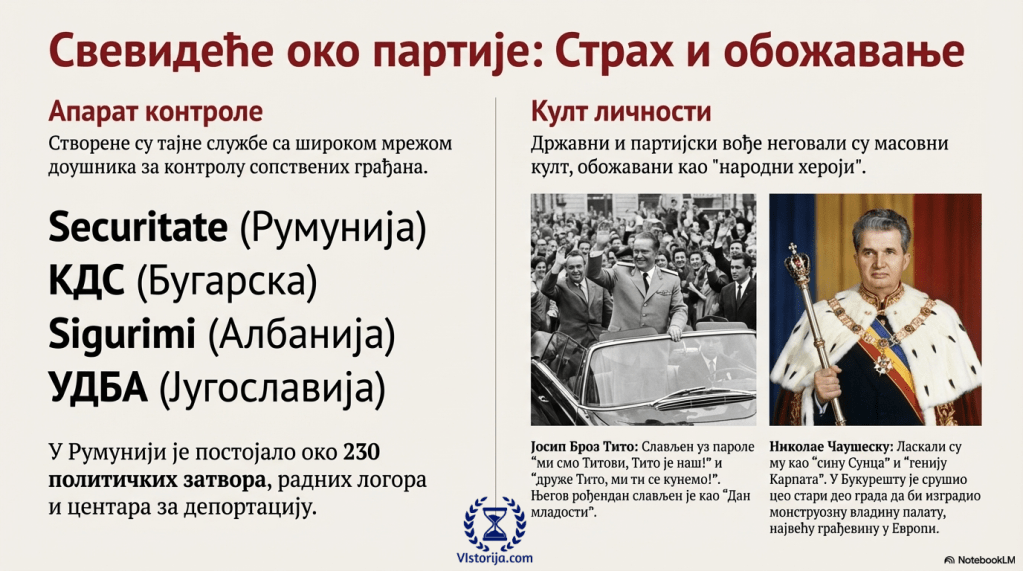 Државни и партијски вође неговали су масовни култ личности, налик Стаљину. Они су обожавани као „народни хероји“ или „хероји социјалистичког рада“, и овековечени на уметничким сликама, статуама и бистама. Јосипа Броза Тита народ је славио уз маршеве и параде, махањем заставица и клицањем „ми смо Титови, Тито је наш!“, или певањем у хору „друже Тито, ми ти се кунемо!“ Његов званични дан рођења слављен је у тој вишенационалној држави као „Дан младости путовањем штафете по целој земљи. Николае Чаушеску уживао је да му ласкају као „сину Сунца“ и генију Карпата“, и да га сликају као „вођу“ са цептером и жезлом. У Букурешту је 1980-их година један цео стари део града морао да буде уклоњен ради изградње монстуозне владине палате, највеће грађевине у Европи.“