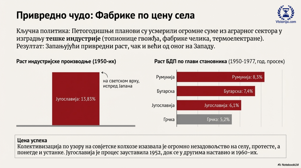 Огромне инвестиције у индустрију, при повољним условима глобалне коњунктуре, довели су до једног, до тада невиђеног, привредног раста. За двадесет година после рата у запањујућој мери је порастао бруто домаћи производ, Индустријска производња, продуктивност и реалне наднице. Тако су социјалистичке земље југоисточне Европе – као и цео континент – доживеле „привредно чудо“. Стопе раста су биле чак и веће од оних на Западу. Југославија је 1950-их година по расту индустријске производње од 13,83% била на светском врху, чак испред Јапана. Приходи су расли између 1953. и 1959. за 5,9% годишње. Измеду 1950. и 1977. бруто друштвени производ по константним ценама растао је по глави становника у Румунији за 8.3%, у Бугарској за 7,4%, у Југославији за 6,1% и у Албанији за 4,7% годишње. Грчка, која није била комунистичка, такође је имала значајан привредни раст од 5,2% годишње, чиме је претекла Шпанију и Португалију. То је довело до раста реалних прихода у Југославији, Румунији и Бугарској измеду 1950. и 1970. за више од 150%, што је било много више него у Пољској, Мађарској и Чехословачкој. У Албанији је доходак по глави становника између 1960. и 1981. порастао за службенике за скоро 40%, а за земљораднике за скоро 57%.