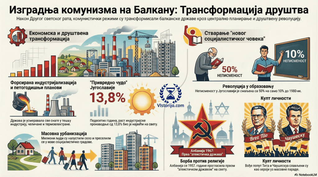Од када је рат завршен, милиони људи су напуситили село ради трајног насељавања у граду. Многима је рад у индустрији био додатна зарада, и радили су ван свог места боравка, путујући на посао. Урбанизација је сматрана стубом модерног друштва и симболом напретка, са функционалним и монотоним стамбеним блоковима, стаљинистичким репрезентативним грађевинама и футуристичким небодерима, модерним болницама, универзитетима, библиотекама, хотелима, радиостаницама и стадионима. Настали су читави нови социјалистички „експериментални градови“, у којима су индустријализација и урбанизација паралелно текле, нпр. у бугарском граду Димитровград. Комунисти су изражавали уверење да ће „истовремено са растом огромних фабрика и термоелектрана [у Димитровграду]“, настати и стотине нових, сјајних људи, убеђених градитеља новог живота“. У Југославији Бугарској и Румунији 1980-их година живело је коначно више људи у градовима него на селу. Уосталом, тако је било и у капиталистичкој Грчкој.